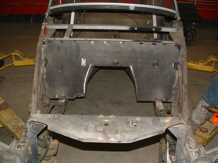 Inside the car after the firewall is installed and the old shifter hole has been welded up.